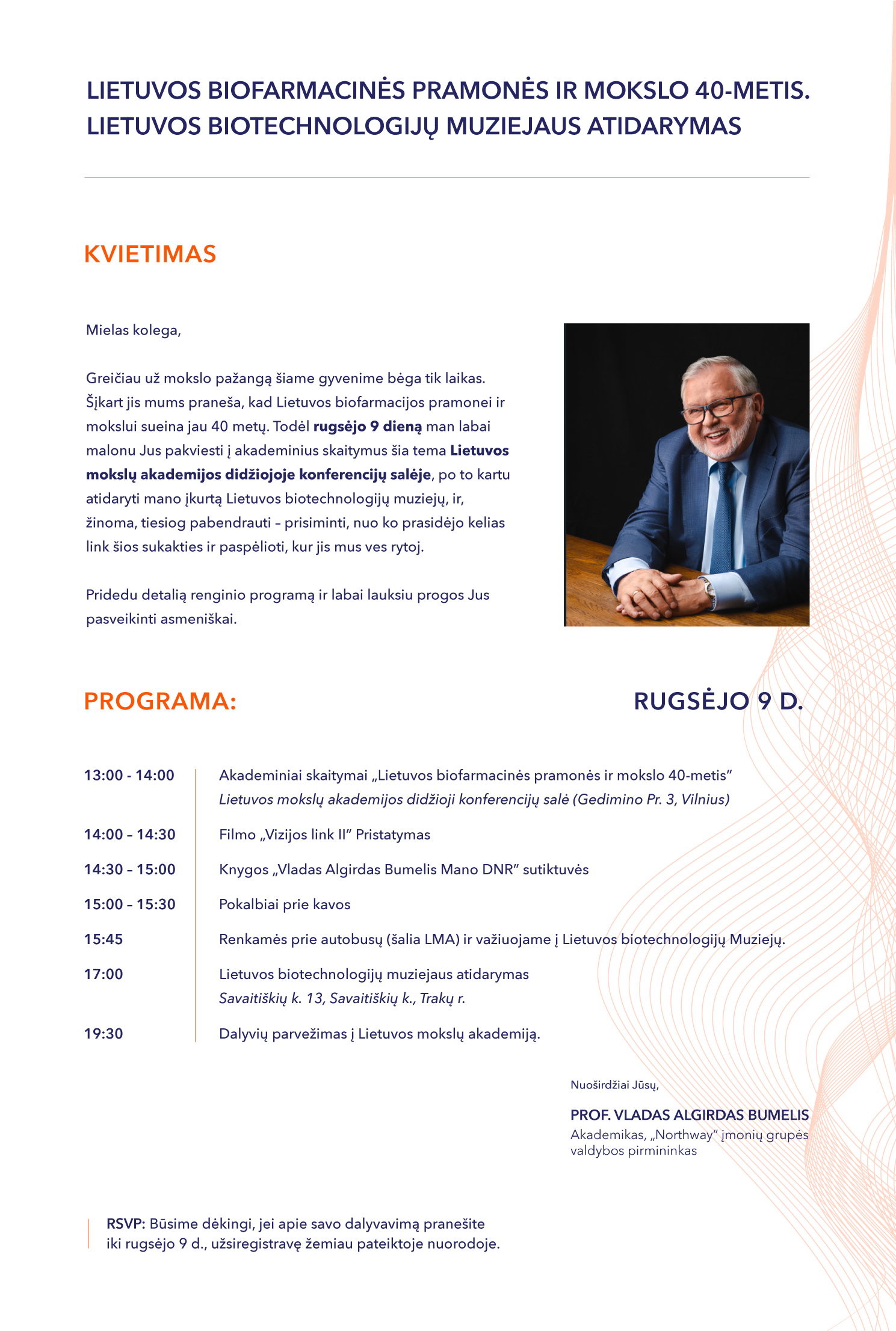 Akademikas prof. Vladas Algirdas Bumelis 2024 m. rugsėjo 9 d. (pirmadienį) 13 val. kviečia dalyvauti akademiniuose skaitymuose „Lietuvos biofarmacinės pramonės ir mokslo 40-metis“ Lietuvos mokslų akademijoje Didžiojoje konferencijų salėje (Gedimino pr. 3, Vilnius).