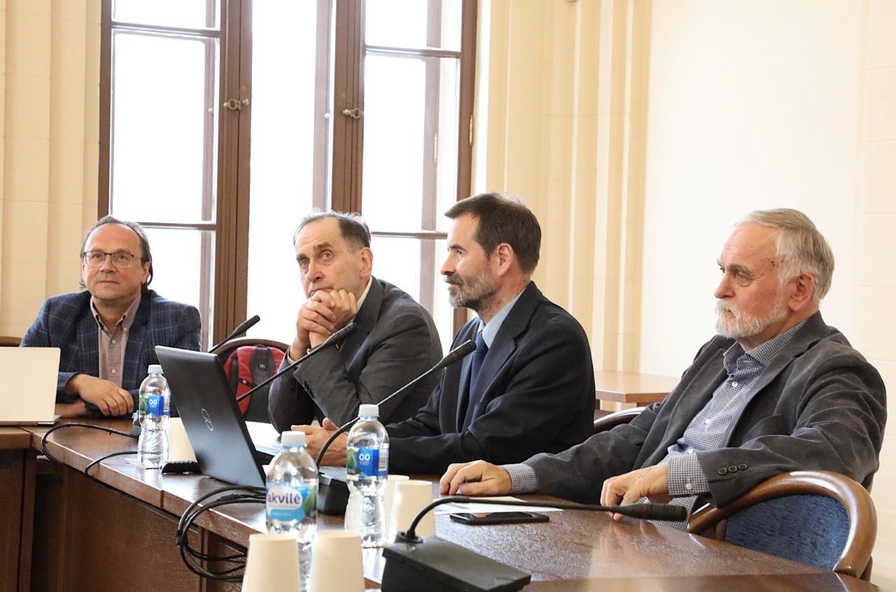 Iš kairės: akad. Zenono Rokaus Rudziko sūnus Andrius, akad. Gediminas Juzeliūnas, dr. Andrius Bernotas, akad. Leonas Valkūnas.