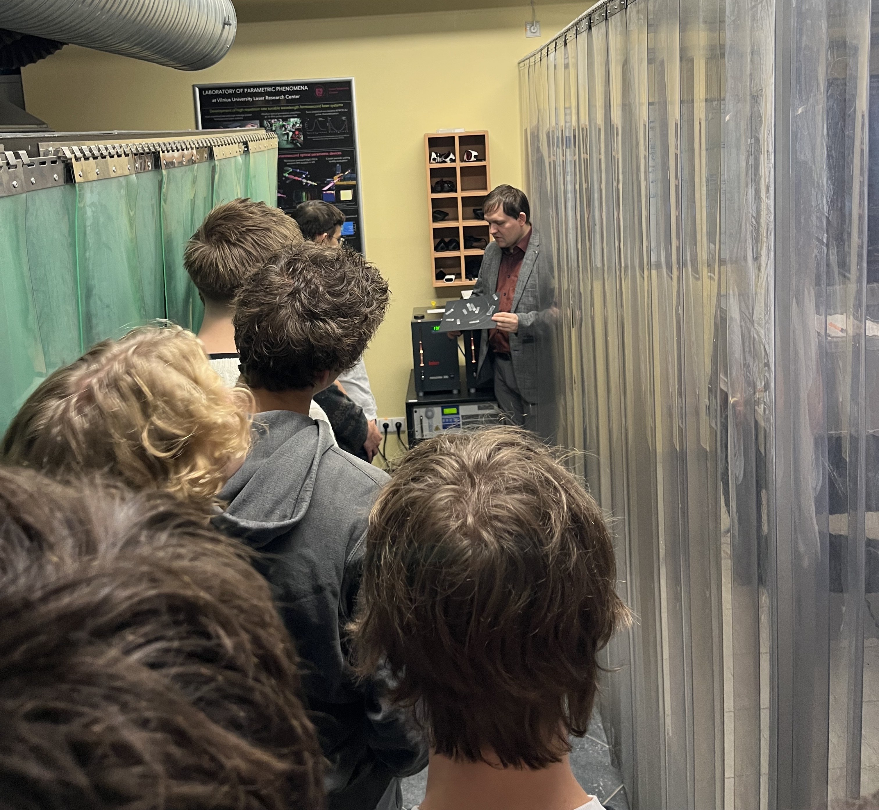 VU Lazerinių tyrimų centre vyko ekskursija „Lazerio spinduliuotės sąveikos su medžiaga ypatybės: netiesinė optika, medžiagų mikroapdirbimas bei nanofotonika“. Čia gausiai susirinkusius moksleivius priėmė LMA Jaunosios akademijos (LMAJA) vicepirmininkas dr. Julius Vengelis. Kartu su kolegomis doktorantais jis vedė ekskursiją po įvairias centro laboratorijas. Moksleiviai buvo supažindinti su lazerių veikimo principais ir jų taikymais moksle bei kasdieniame gyvenime. Jie sužinojo, kokie tyrimai vykdomi VU LTC ir kodėl jie yra prasmingi. LMAJA vicepirmininkas dr. J. Vengelis pristatė jo vadovaujamą Parametrinių reiškinių laboratoriją ir papasakojo apie joje vykdomus lazerinių šaltinių vystymo bei netiesinės optikos tyrimus. Doktorantas Gabrielius Kontenis supažindino su lazerinio apdirbimo laboratorija ir fotoninių elementų diagnostikos tyrimų laboratorija. Doktorantas Evaldas Kažukauskas moksleiviams pristatė Lazerinio mikroapdirbimo technologijų laboratoriją bei pademonstravo keletą joje pagamintų objektų.
