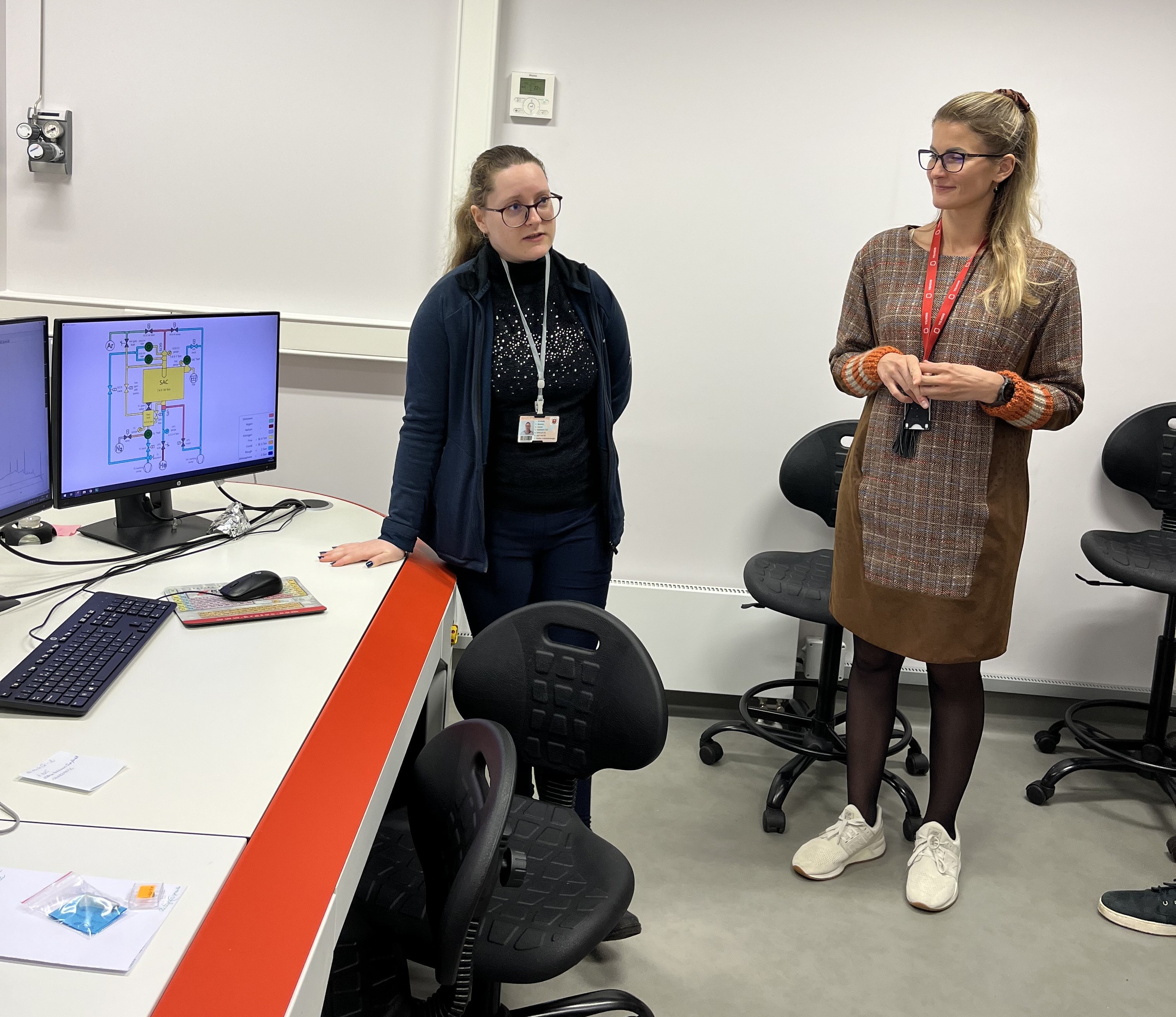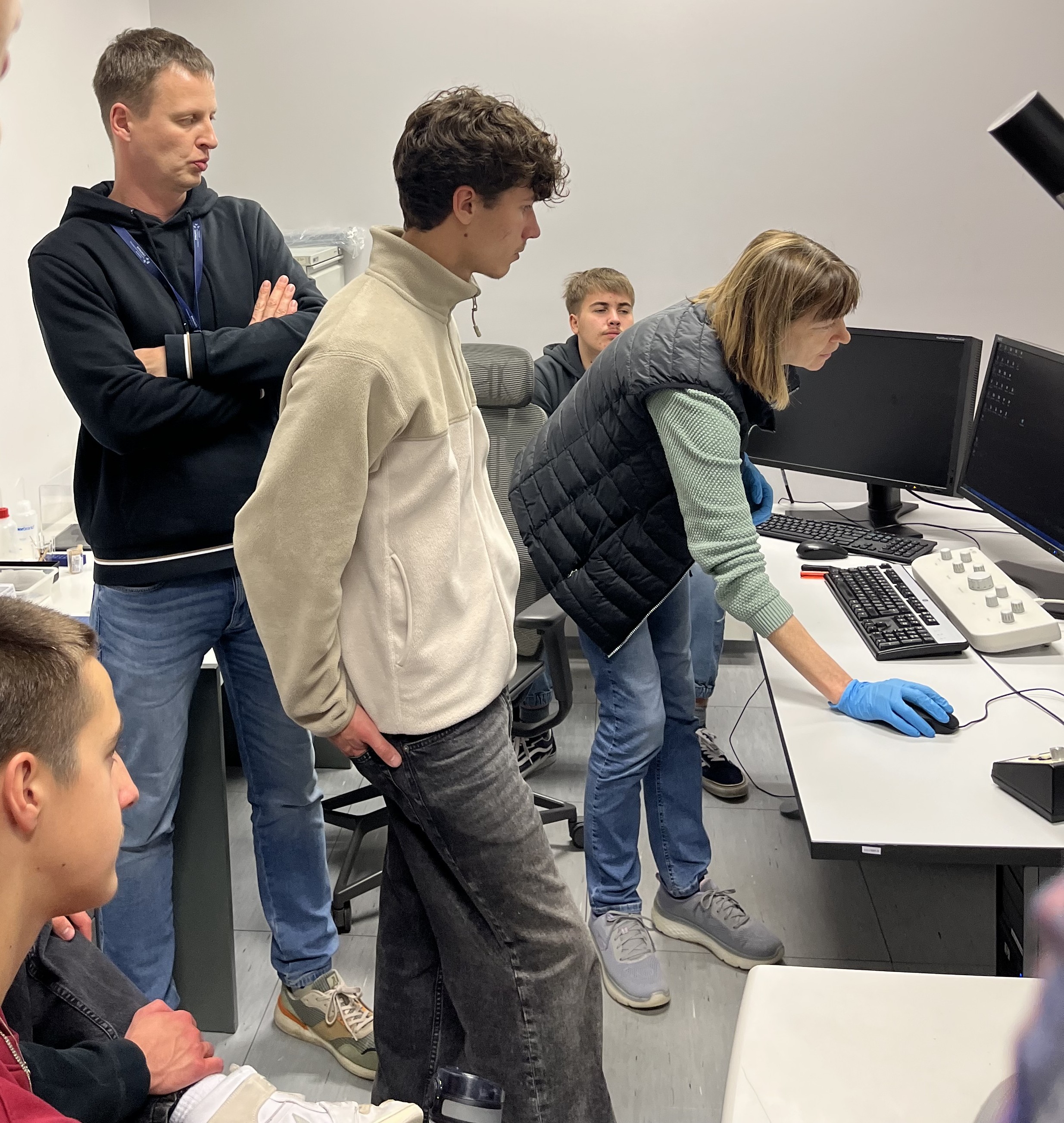 Ekskursijos antroje dalyje moksleiviai lankėsi FTMC Medžiagų struktūrinės analizės skyriaus laboratorijose. Centro darbuotojas dr. Vidas Pakštas kartu su kolegomis pristatė medžiagų struktūrinių savybių matavimo metodikas. Vilniaus Mykolo Biržiškos moksleiviai dalyvavo ekskursijoje „Medžiagų struktūrinių savybių matavimo metodikos: SEM, TEM, XRD, XPS“, kurios pagrindinis tikslas buvo supažindinti moksleivius su pažangiais medžiagų struktūrinių savybių tyrimo metodais ir naudojamais prietaisais. Moksleiviai sužinojo, kad skenuojamuoju elektroniniu mikroskopu (SEM) galima tirti medžiagų paviršiaus morfologiją, vaizdą padidinus 100 tūkst. kartų, ar stebėti ir analizuoti plonų plėvelių skersinius pjūvius, jas tiesiog perpjaunant Ga jonų spinduliu. SEM veikimą ir panaudojimą pristatė dr. Aušra Selskienė ir dr. Arnas Naujokaitis.