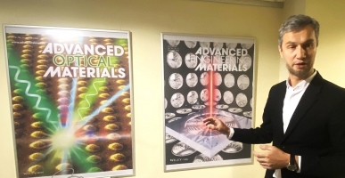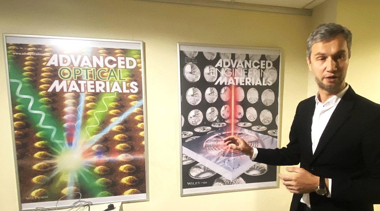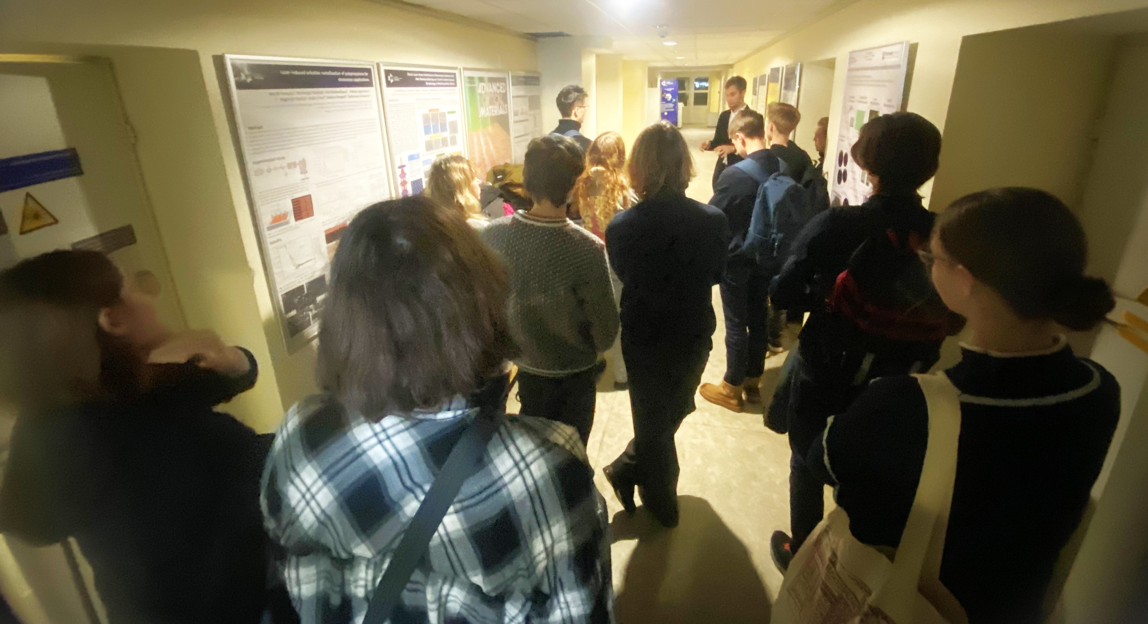 Dr. M. Gedvilas atkreipė mokinių dėmesį į žurnalų „Advanced Optical Materials“ ir „Advanced Engineering Materials“ viršelių plakatus, kuriuose publikuojamos FTMC LTS mokslininkų straipsnių iliustracijos (nuotrauka viršuje).