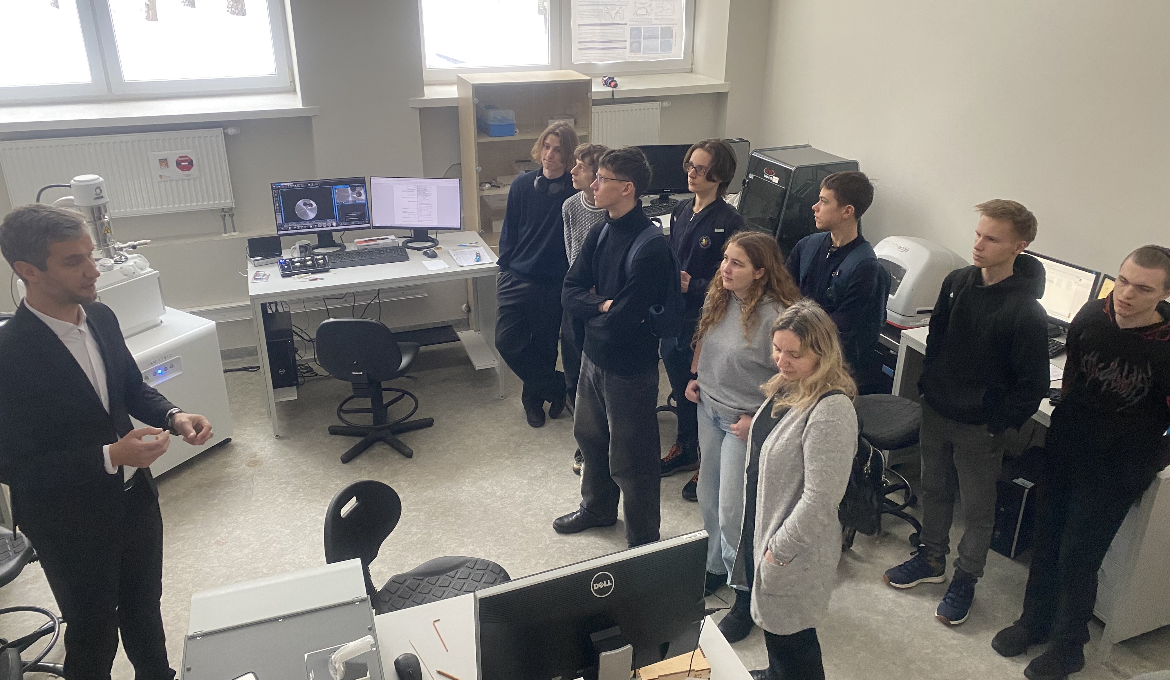 Ekskursija tęsėsi Optoelektroninių sistemų charakterizavimo laboratorijoje. Dr. M. Gedvilas paaiškino, kad norint stebėti mikrometrines ir nanometrines struktūras, laboratorijoje naudojami įvairūs modernūs vizualizavimo prietaisai. Lektorius parodė ir papasakojo apie laboratorijoje naudojamus prietaisus: optininį mikroskopą, 3D optinį profilometrą, elektroninį mikroskopą, spektrometrą, adatinį profilometrą, atominių jėgų mikroskopą ir kitus.