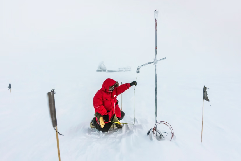 „IceCube“ neutrinų observatorijos tyrėjas atlieka sniego matavimus Pietų ašigalyje. Antarkties sutartimi Antarktis paskelbta mokslo draustiniu ir įtvirtinti principai, kurie ir šiandien leidžia vykdyti mokslinius tyrimus. Martin Wolf, IceCube / NSF.