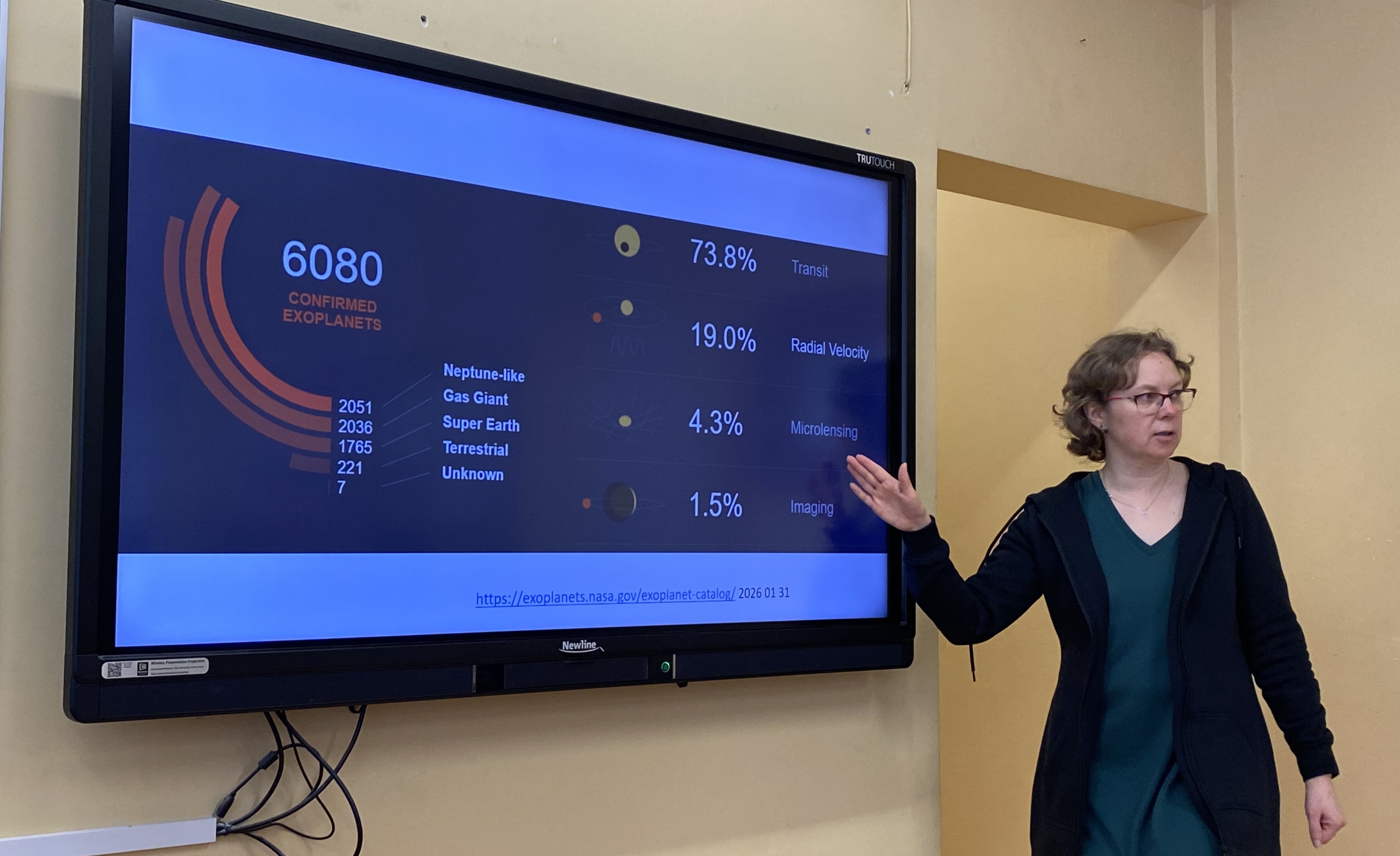 Mokiniams buvo pristatyti pagrindiniai egzoplanetų paieškos metodai: tranzitų metodas, radialinių greičių metodas, astrometrija, gravitacinio lęšio efektas ir tiesioginiai stebėjimai. Lektorė pabrėžė, kad tranzitų metodas – vienas efektyviausių ir dažniausiai naudojamų, leidžiantis ne tik aptikti planetą, bet ir įvertinti jos dydį. Šis metodas pagrįstas tuo, kad planeta, praskriedama priešais žvaigždę, trumpam sumažina jos šviesį. Radialinių greičių metodas remiasi žvaigždės judėjimo pokyčių fiksavimu, kuriuos sukelia aplink ją skriejanti planeta. Astrometrija tiria žvaigždžių padėties pokyčius, o gravitacinio lęšio efektas pasitelkiamas tada, kai tarp mūsų ir stebimos žvaigždės praskriejanti planeta sustiprina jos šviesą. Dr. R. Minkevičiūtė pažymėjo, kad nors tiesioginiai stebėjimai leidžia užfiksuoti menką šviesos „pikseliuką“ šalia žvaigždės, šis metodas išlieka itin sudėtingas. Visų taikomų metodų įvairovė leidžia aptikti tiek dideles dujines, tiek mažesnes, Žemės tipo planetas, o technologijoms tobulėjant jų savybės tiriamos vis tiksliau.