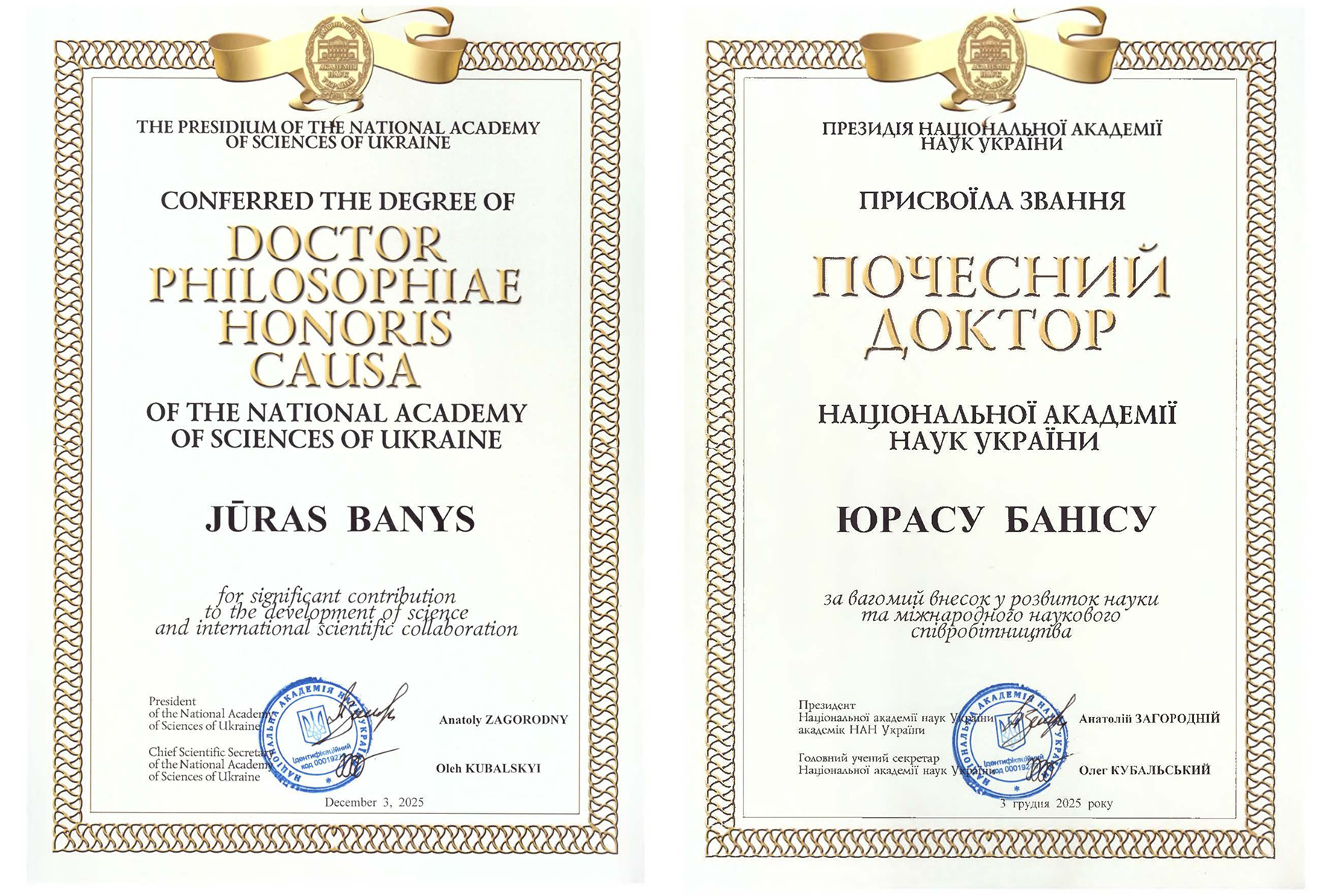 Buvusiam Lietuvos mokslų akademijos (LMA) prezidentui, šiuo metu – prezidiumo nariui, Vilniaus universiteto (VU) Fizikos fakulteto profesoriui akad. Jūrui Baniui suteiktas Ukrainos nacionalinės mokslų akademijos (UNMA) garbės daktaro vardas už reikšmingą indėlį į mokslo plėtrą ir tarptautinį mokslinį bendradarbiavimą.