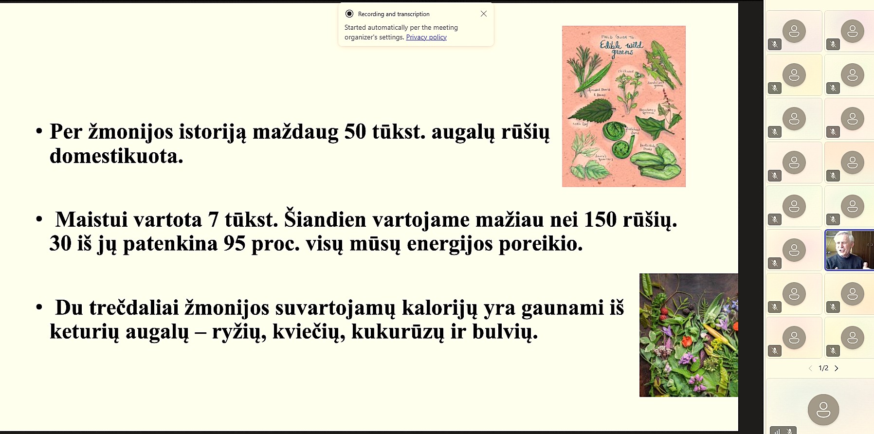 Paskaitoje ypatingas dėmesys buvo skirtas augalų svarbai žmogaus mityboje. Kaip pabrėžė lektorius, šiuo metu 100 proc. mūsų maisto yra augalinės kilmės, nesvarbu, ar valgome tiesiogiai augalus, ar gyvūninius produktus, kuriems augalai tarnauja kaip pašaras. Anot jo, „net ir mėsos ar pieno produktai yra netiesiogiai augalinės kilmės, nes gyvuliai minta augalais.“