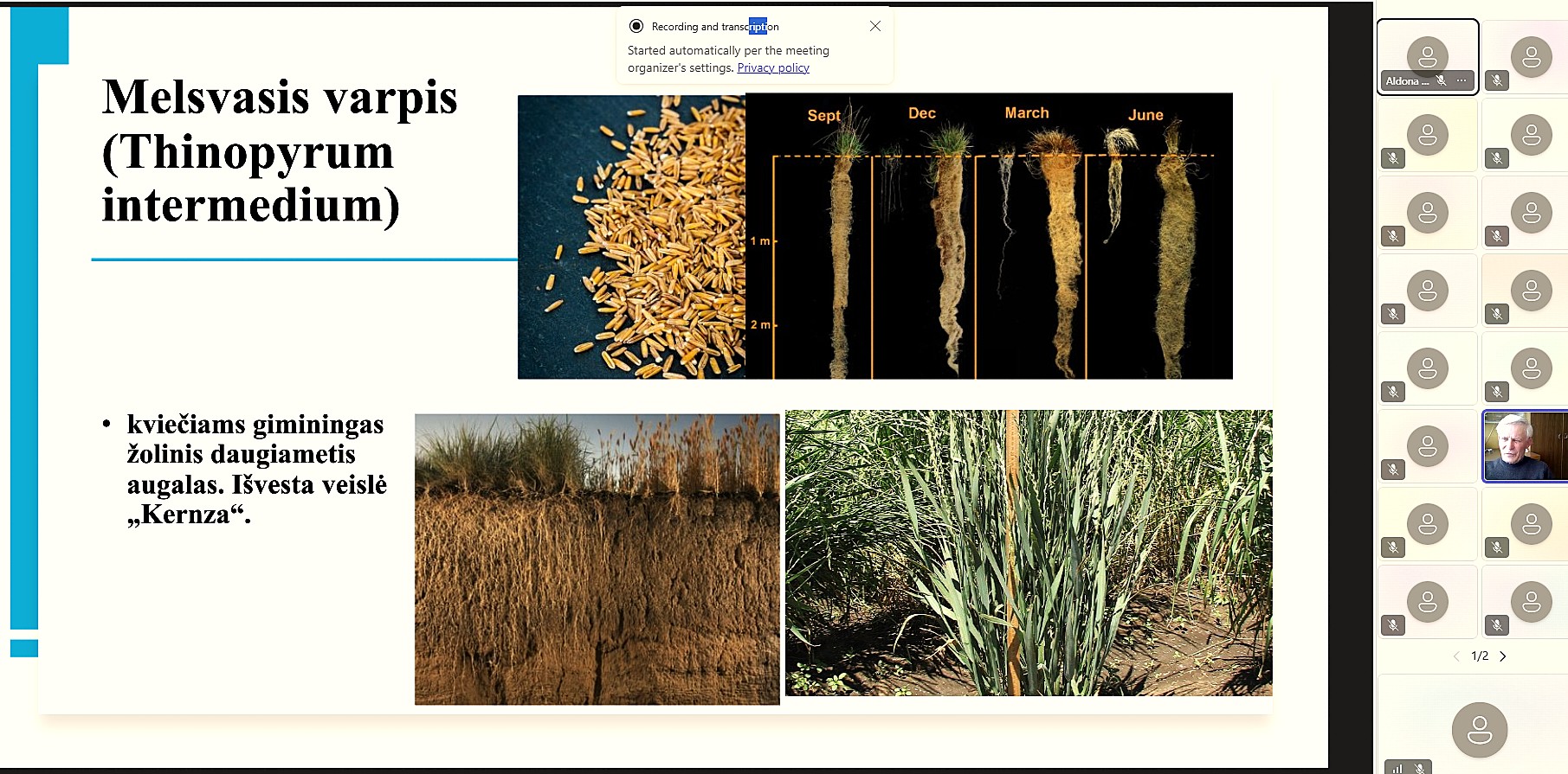 Akad. V. Stanys paskaitoje paminėjo melsvąjį varpį – daugiametį miglinį augalą, kuris naudojamas ne tik maistui, bet ir dirvožemiui atkurti. Veislė ‘Kernza’, kol kas dar nusileidžianti derliumi vasariniams kviečiams, jau plačiai auginama pasaulyje, o daugiamečiai augalai apskritai prisideda prie geresnių dirvožemių formavimosi.
