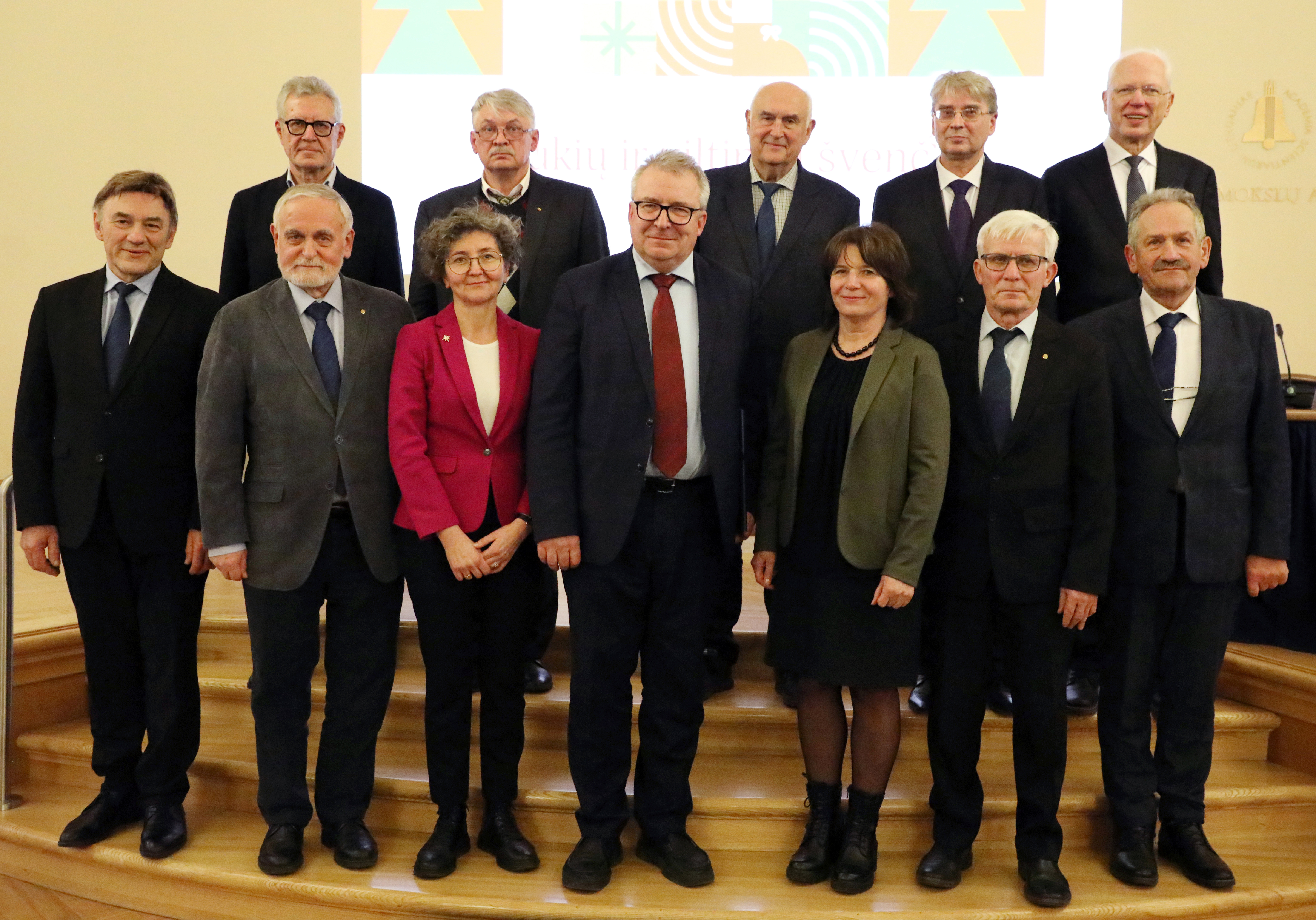 Front row, left to right, academicians Juozas Augutis, Leonas Valkūnas, Aušra Maslaukaitė, Vytautas Nekrošius, Aurelija Žvirblienė, Vidmantas Stanys, and Zenonas Dabkevičius; second row, left to right, academicians Ričardas Makuška, Aivaras Kareiva, Gintautas Dzemyda, Jūras Banys, and Limas Kupčinskas.